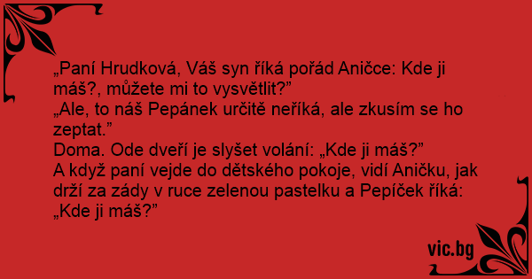 A když paní vejde do dětského pokoje, vidí Aničku, jak drží za zády v ruce zelenou pastelku a Pepíček říká: „Kde ji máš?”