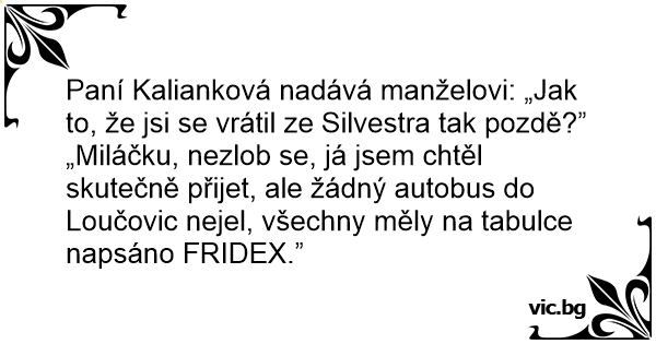 „Miláčku, nezlob se, já jsem chtěl skutečně přijet, ale žádný autobus do Loučovic nejel, všechny měly na tabulce napsáno FRIDEX.”