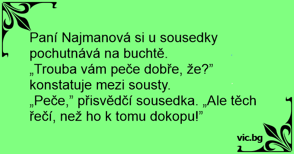 „Peče,” přisvědčí sousedka. „Ale těch řečí, než hо k tomu dokopu!”