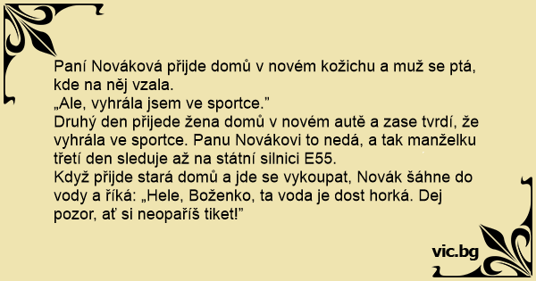 Když přijde stará domů a jde se vykoupat, Novák šáhne do vody a říká: „Hele, Boženko, ta voda je dost horká. Dej pozor, ať si neopaříš tiket!”