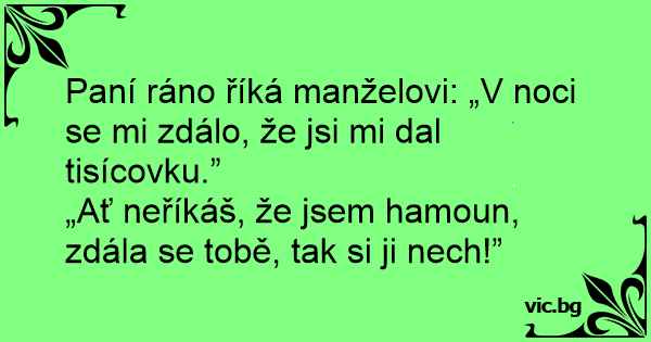 Paní ráno říká manželovi: „V noci se mi zdálo, že jsi mi dal tisícovku.”