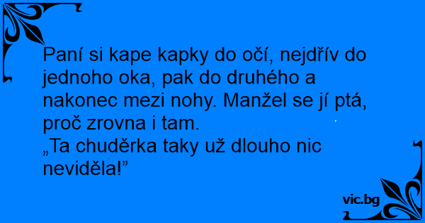 Paní si kape kapky do očí, nejdřív do jednoho oka, pak do druhého a nakonec mezi nohy. Manžel se jí ptá, proč zrovna i tam.
