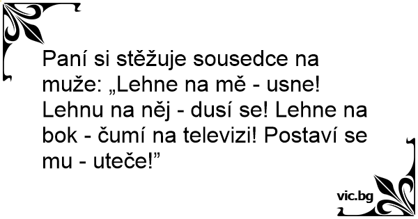 Paní si stěžuje sousedce na muže: „Lehne na mě - usne! Lehnu na něj - dusí se! Lehne na bok - čumí na televizi! Postaví se mu - uteče!”