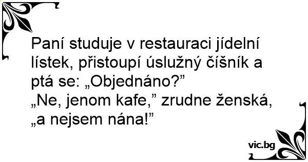 „Ne, jenom kafe,” zrudne ženská, „a nejsem nána!”