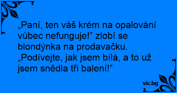 „Paní, ten váš krém na opalování vůbec nefunguje!” zlobí se blondýnka na prodavačku. „Podívejte, jak jsem bílá, a to už jsem snědla tři balení!”