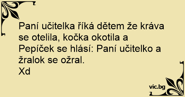 Paní učitelka říká dětem že kráva se otelila, kočka okotila a Pepíček se hlásí: Paní učitelko a žralok se ožral.