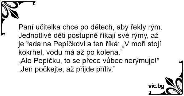 Paní učitelka chce po dětech, aby řekly rým. Jednotlivé děti postupně říkají své rýmy, až je řada na Pepíčkovi a ten říká: „V moři stojí kokrhel, vodu má až po kolena.”