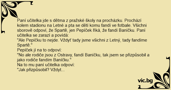 A všemožně Pepíčka přesvědčuje. Pepíček jí ale zase odpoví, že se přizpůsobil rodičům a že fandí Baníku. Paní učitelce už dojde trpělivost a Pepíčka se zeptá: