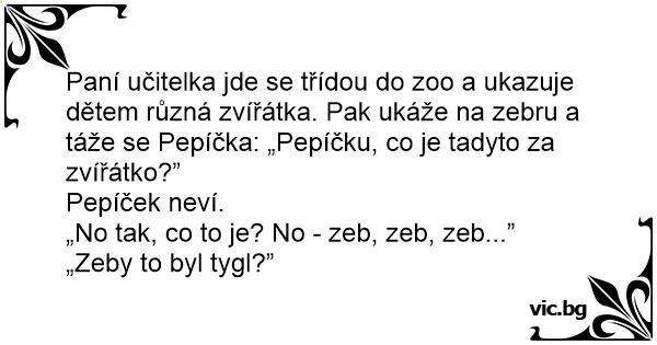 Paní učitelka jde se třídou do zoo a ukazuje dětem různá zvířátka. Pak ukáže na zebru a táže se Pepíčka: „Pepíčku, co je tadyto za zvířátko?”