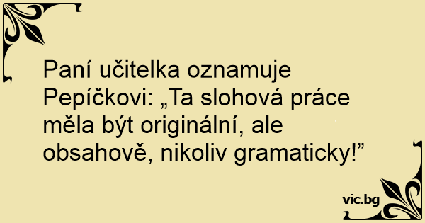 Paní učitelka oznamuje Pepíčkovi: „Ta slohová práce měla být originální, ale obsahově, nikoliv gramaticky!”