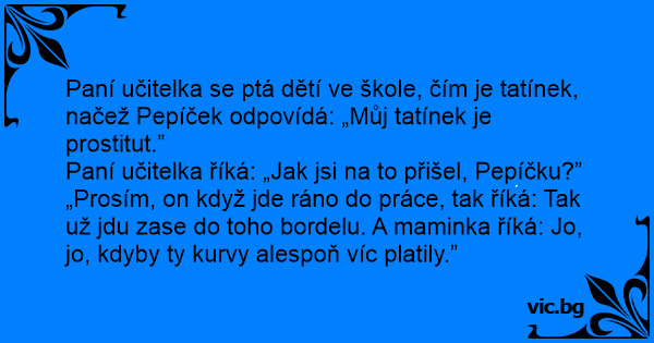 Paní učitelka se ptá dětí ve škole, čím je tatínek, načež Pepíček odpovídá: „Můj tatínek je prostitut.”