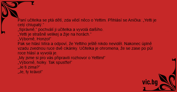 Paní učitelka se ptá dětí, zda vědí něco o Yettim. Přihlásí se Anička: „Yetti je celý chlupatý.”