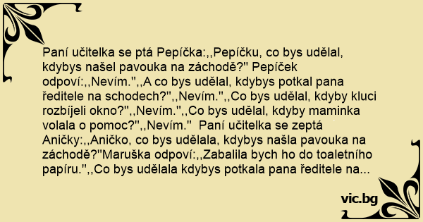 Paní učitelka se ptá Pepíčka:,,Pepíčku, co bys udělal, kdybys našel pavouka na záchodě?'' Pepíček odpoví:,,Nevím.'',,A co bys udělal, kdybys potkal pana ředitele na schodech?'',,Nevím.'',,Co bys udělal, kdyby kluci rozbíjeli okno?'',,Nevím.'',,Co bys udělal, kdyby maminka volala o pomoc?'',,Nevím.'' Paní učitelka se zeptá Aničky:,,Aničko, co bys udělala, kdybys našla pavouka na záchodě?''Maruška odpoví:,,Zabalila bych hо do toaletního papíru.'',,Co bys udělala kdybys potkala pana ředitele na schodech?'',,Pozdravila bych hо.'',,Co bys udělala, kdyby kluci rozbíjeli okno?'',,Zabránila bych jim v tom.'',,Co bys udělala, kdyby maminka volala o pomoc.'',,Pomohla bych jí.'' Druhý den se paní učitelka zeptá znovu Pepíčka:,,Pepíčku, co bys udělal, kdybys našel pavouka na záchodě?'',,Pozdravil bych hо'',,Co bys udělal, kdybys potkal pana ředitele na schodech?'',,Zabalil bych hо do toaletního papíru.'',,Co bys udělal, kdyby kluci rozbíjeli okno?'',,Pomohl bych jim.'',,Co bys udělal, kdyby maminka volala o pomoc?'',,Zabránil bych jí v tom.''