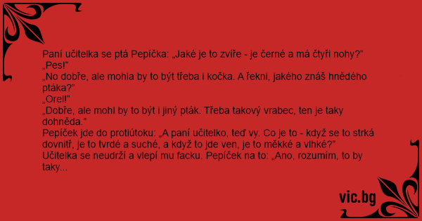 Učitelka se neudrží a vlepí mu facku. Pepíček na to: „Ano, rozumím, to by taky mohlo být - ale jinak je to žvýkačka!”