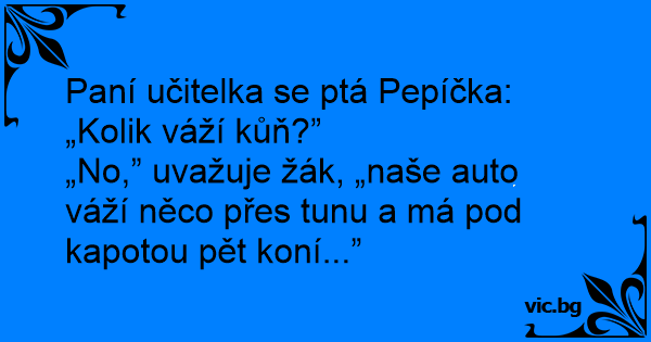 Paní učitelka se ptá Pepíčka: „Kolik váží kůň?”