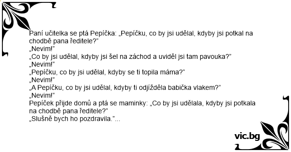 Pepíček přijde domů a ptá se maminky: „Co by jsi udělala, kdyby jsi potkala na chodbě pana ředitele?”