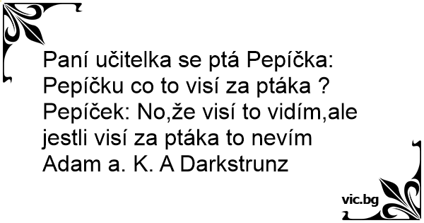 Paní učitelka se ptá Pepíčka: Pepíčku co to visí za ptáka ? Pepíček: No,že visí to vidím,ale jestli visí za ptáka to nevím
