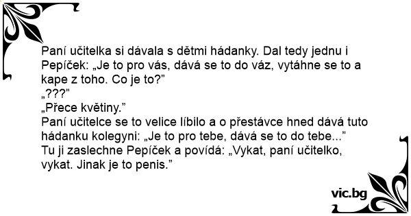 Paní učitelce se to velice líbilo a o přestávce hned dává tuto hádanku kolegyni: „Je to pro tebe, dává se to do tebe...”