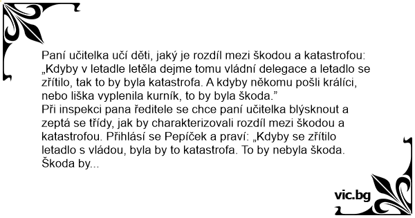 Paní učitelka učí děti, jaký je rozdíl mezi škodou a katastrofou: „Kdyby v letadle letěla dejme tomu vládní delegace a letadlo se zřítilo, tak to by byla katastrofa. A kdyby někomu pošli králíci, nebo liška vyplenila kurník, to by byla škoda.”