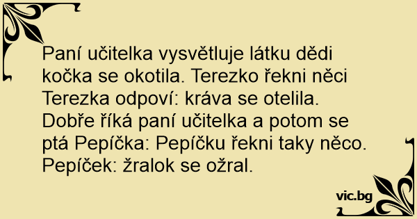 Paní učitelka vysvětluje látku dědi kočka se okotila. Terezko řekni něci Terezka odpoví: kráva se otelila. Dobře říká paní učitelka a potom se ptá Pepíčka: Pepíčku řekni taky něco. Pepíček: žralok se ožral.