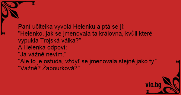 "Helenko, jak se jmenovala ta královna, kvůli které vypukla Trojská válka?"
