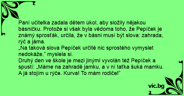 Paní učitelka zadala dětem úkol, aby složily nějakou básničku. Protože si však byla vědoma toho, že Pepíček je známý sprosťák, určila, že v básni musí být slova: zahrada, rýč a jáma.