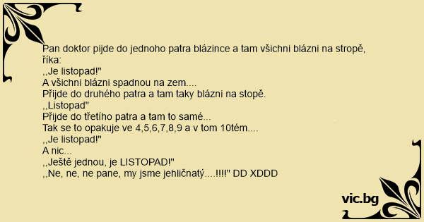 Pan doktor pijde do jednoho patra blázince a tam všichni blázni na stropě, říka: