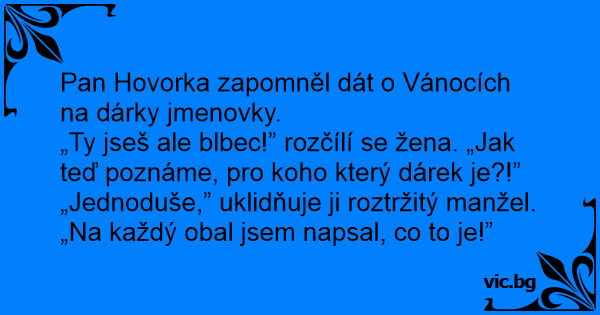 „Ty jseš ale blbec!” rozčílí se žena. „Jak teď poznáme, pro koho který dárek je?!”