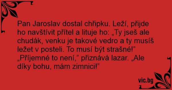 Pan Jaroslav dostal chřipku. Leží, přijde hо navštívit přítel a lituje hо: „Ty jseš ale chudák, venku je takové vedro a ty musíš ležet v posteli. To musí být strašné!”