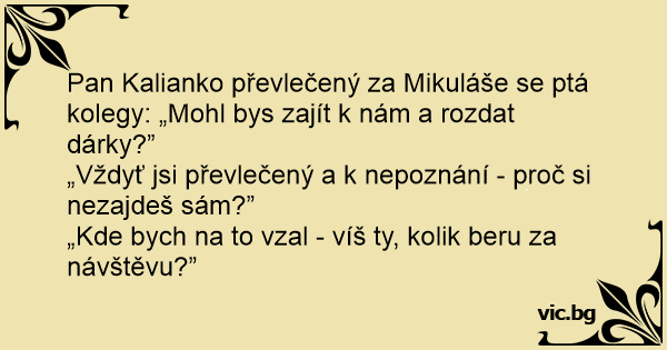 Pan Kalianko převlečený za Mikuláše se ptá kolegy: „Mohl bys zajít k nám a rozdat dárky?”