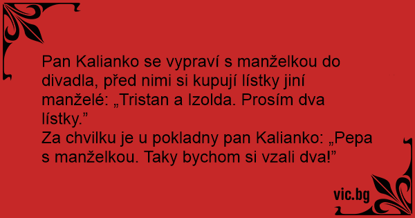 Za chvilku je u pokladny pan Kalianko: „Pepa s manželkou. Taky bychom si vzali dva!”