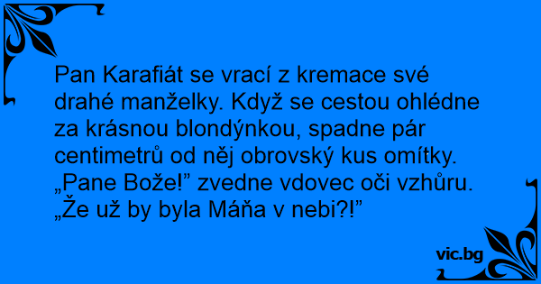 „Pane Bože!” zvedne vdovec oči vzhůru. „Že už by byla Máňa v nebi?!”