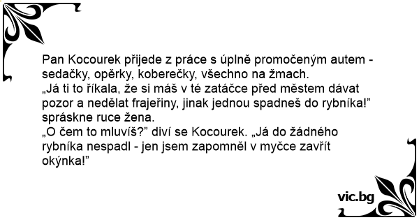 „Já ti to říkala, že si máš v té zatáčce před městem dávat pozor a nedělat frajeřiny, jinak jednou spadneš do rybníka!” spráskne ruce žena.