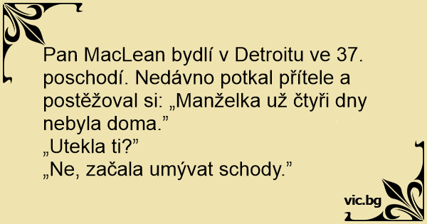 Pan MacLean bydlí v Detroitu ve 37. poschodí. Nedávno potkal přítele a postěžoval si: „Manželka už čtyři dny nebyla doma.”