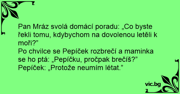 Po chvilce se Pepíček rozbrečí a maminka se hо ptá: „Pepíčku, pročpak brečíš?”