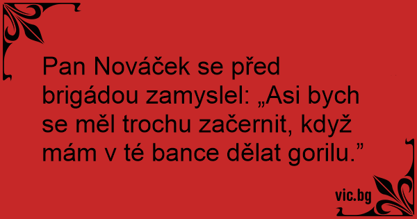 Pan Nováček se před brigádou zamyslel: „Asi bych se měl trochu začernit, když mám v té bance dělat gorilu.”