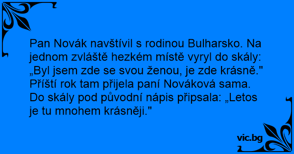 Pan Novák navštívil s rodinou Bulharsko. Na jednom zvláště hezkém místě vyryl do skály: „Byl jsem zde se svou ženou, je zde krásně." Příští rok tam přijela paní Nováková sama. Do skály pod původní nápis připsala: „Letos je tu mnohem krásněji."