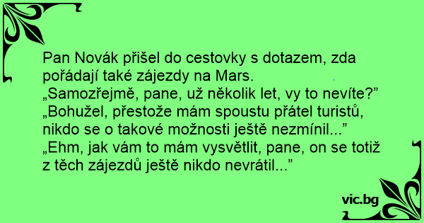 Pan Novák přišel do cestovky s dotazem, zda pořádají také zájezdy na Mars.
