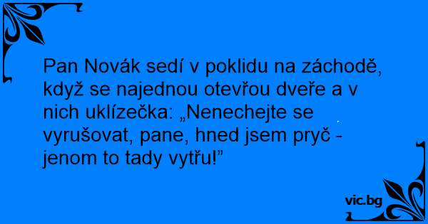 Pan Novák sedí v poklidu na záchodě, když se najednou otevřou dveře a v nich uklízečka: „Nenechejte se vyrušovat, pane, hned jsem pryč - jenom to tady vytřu!”