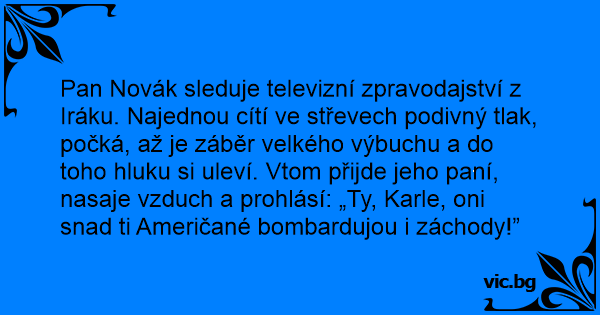 Pan Novák sleduje televizní zpravodajství z Iráku. Najednou cítí ve střevech podivný tlak, počká, až je záběr velkého výbuchu a do toho hluku si uleví. Vtom přijde jeho paní, nasaje vzduch a prohlásí: „Ty, Karle, oni snad ti Američané bombardujou i záchody!”