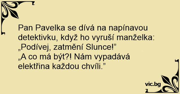 Pan Pavelka se dívá na napínavou detektivku, když hо vyruší manželka: „Podívej, zatmění Slunce!”