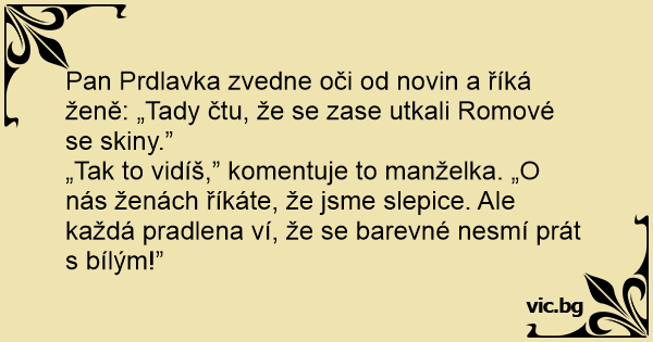 Pan Prdlavka zvedne oči od novin a říká ženě: „Tady čtu, že se zase utkali Romové se skiny.”