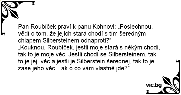 „Kouknou, Roubíček, jestli moje stará s někým chodí, tak to je moje věc. Jestli chodí se Silbersteinem, tak to je její věc a jestli je Silberstein šerednej, tak to je zase jeho věc. Tak o co vám vlastně jde?”