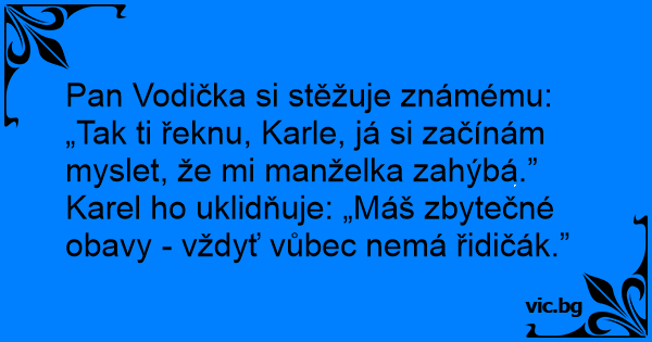 Pan Vodička si stěžuje známému: „Tak ti řeknu, Karle, já si začínám myslet, že mi manželka zahýbá.”