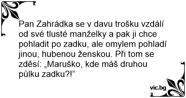 Pan Zahrádka se v davu trošku vzdálí od své tlusté manželky a pak ji chce pohladit po zadku, ale omylem pohladí jinou, hubenou ženskou. Při tom se zděsí: „Maruško, kde máš druhou půlku zadku?!”