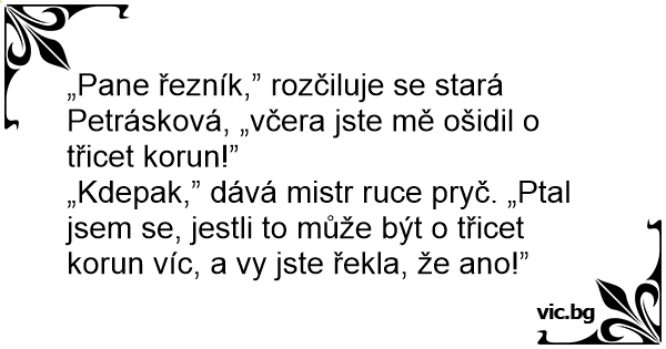 „Pane řezník,” rozčiluje se stará Petrásková, „včera jste mě ošidil o třicet korun!”