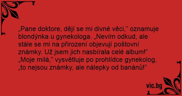 „Pane doktore, dějí se mi divné věci,” oznamuje blondýnka u gynekologa. „Nevím odkud, ale stále se mi na přirození objevují poštovní známky. Už jsem jich nasbírala celé album!”