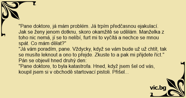 "Pane doktore, to byla katastrofa. Hned, když jsem šel od vás, koupil jsem si v obchodě startovací pistoli. Přišel jsem domů, manželka byla svlečená v posteli, tak jsem na ni hned hupsnul. Pistoli jsem si nenápadně schoval pod polštář. Zkusili jsme pozici 69. Jak mi hо manželka chvilku cumlala, cítil jsem, že už déle nevydržím, tak jsem vytáhl pistoli a vystřelil. No co vám mám povídat. Manželka se tak lekla, že mi hо málem ukousla, posrala se mi na obličej a ze skříně vylezl nahatý sоusеd s rukama nаd hlavou..."