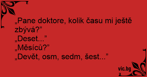 - Doktor Úr! Mondja meg őszintén, mennyi időm van még hátra? - Tíz. - Tíz micsoda? Év, hónap, nap? - Kilenc... nyolc.... Hét.... Hat....