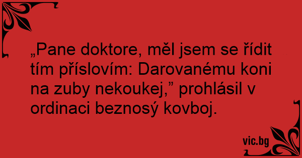 „Pane doktore, měl jsem se řídit tím příslovím: Darovanému koni na zuby nekoukej,” prohlásil v ordinaci beznosý kovboj.